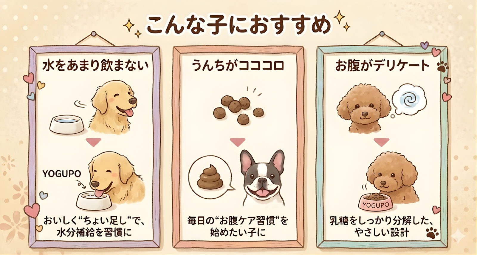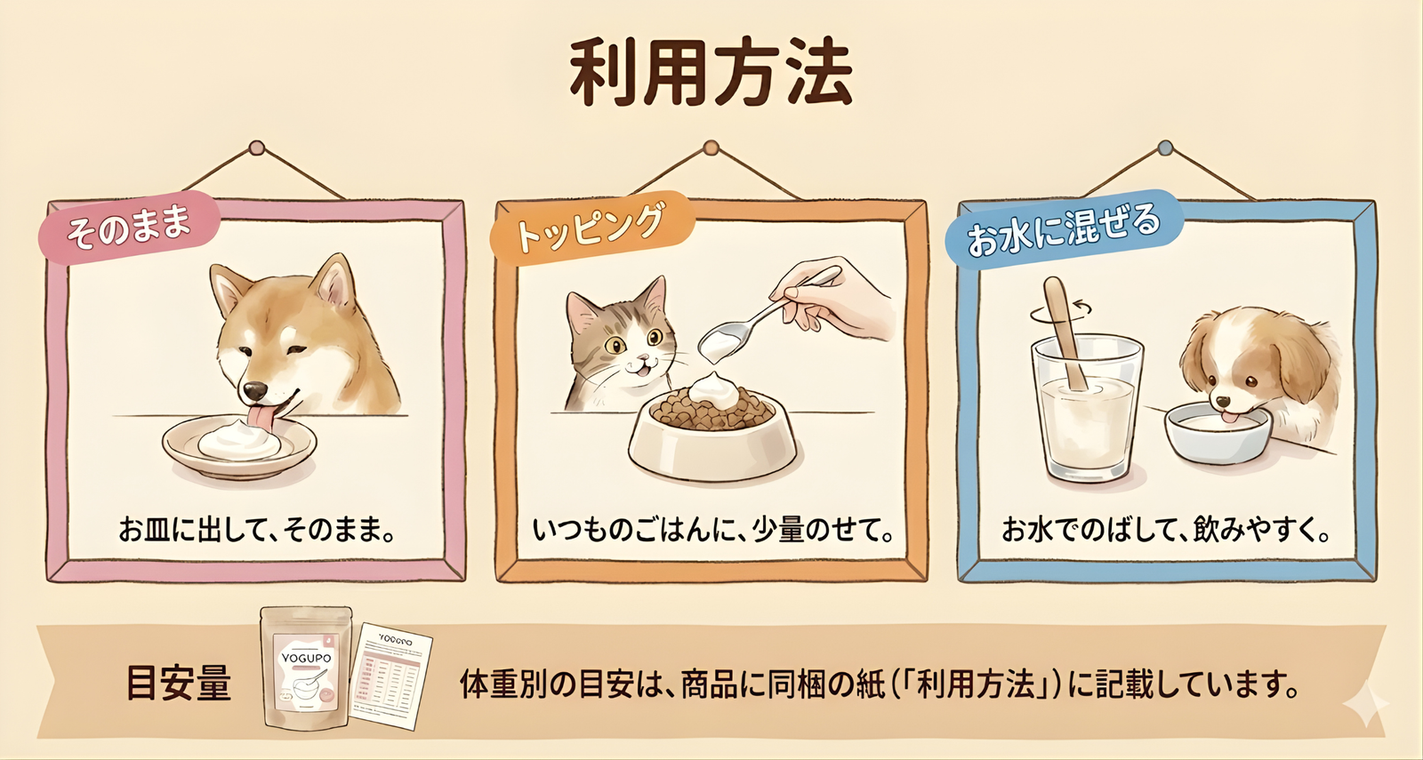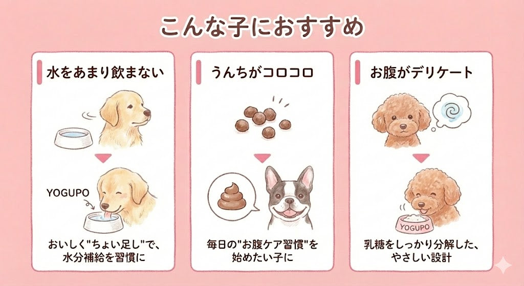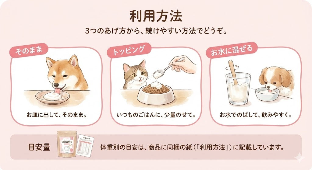 YOGUPOは犬向けに乳糖を99.9%カットし、酸味も抑えた設計です。与える量は少量から始め、体調や様子を見て調整してください。
